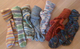 Cant wait to get back to textile related things, I haven't managed to do much. I'd feel a bit mean sitting here under the quilt stitching, I have thought about it though! I've been knitting a scarf for myself using some of the wool I bought at the K&S this year. Usually when I feel stressed I knit socks, this year I've knitted quite a few pairs, here's a picture of just some of them!